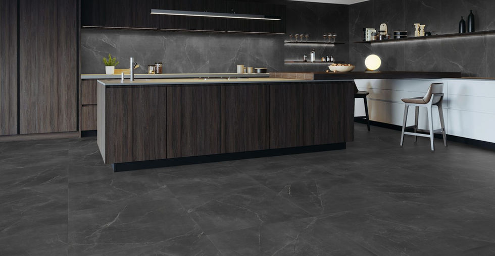 Inspired by natural stone, the porcelain tile has a smooth matte finish.